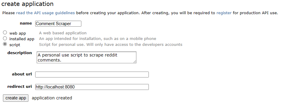 This will open a form where you need to fill in a name, description and redirect uri. The name and description are for your own use and can be anything. I recommend something descriptive. However, you should enter http://localhost:8080 for the redirect uri.