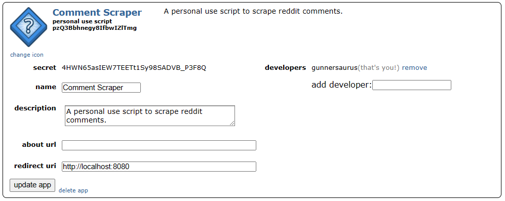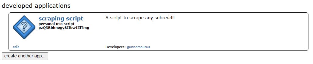 After pressing create app, a new application will appear. client_id is the string listed just under personal use script and client_secret is the string adjacent to secret. The credentials in this picture have been edited, so don’t even try.